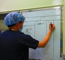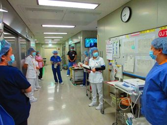 ・朝のミーティング…全員集合して師長の伝達から一日が始まります。麻酔科医師とその日のスケジュールについて簡単に打ち合わせをします。術前情報やスタッフ間の伝達事項など、貴重な情報交換の場です。