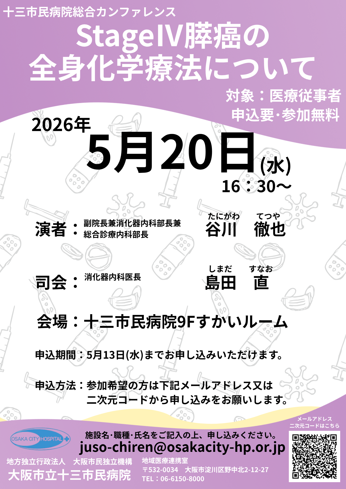 現在表示しているページの位置です。 現在地 ホーム お知らせ 【募集中】5/20(水)16:30 十三市民病院総合カンファレンス 医療関係者【募集中】5/20(水)16:30 十三市民病院総合カンファレンス 2026年04月28日