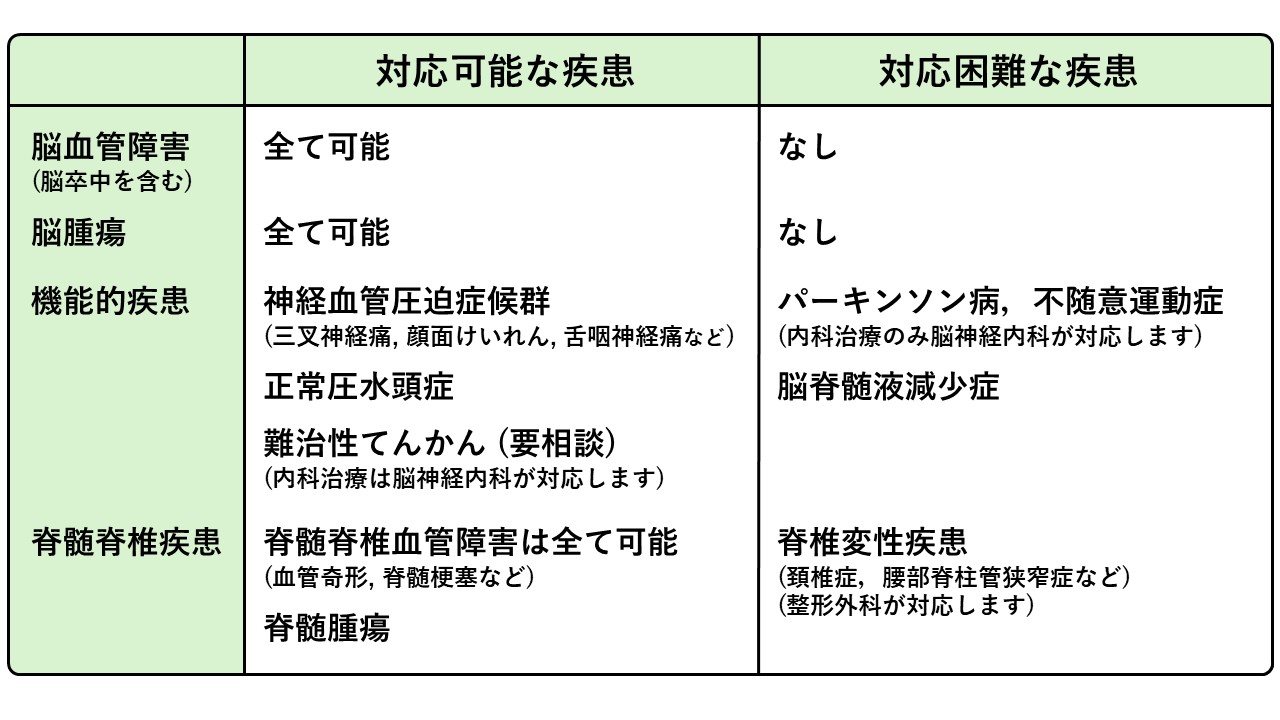 脳神経外科は血管障害 (脳卒中を含む),脳腫瘍,機能的疾患 (神経血管圧迫症候群, 正常圧水頭症など),脊髄脊椎疾患,頭部外傷など,非常に多岐にわたる疾患が対象になります.さらに外科手術のみを行っているのではなく,それぞれの分野で血管内治療 (カテーテル手術),内科的治療 (薬物療法),放射線治療 (定位放射線治療)などの治療法もあり,これら全てを脳神経外科で行っています.