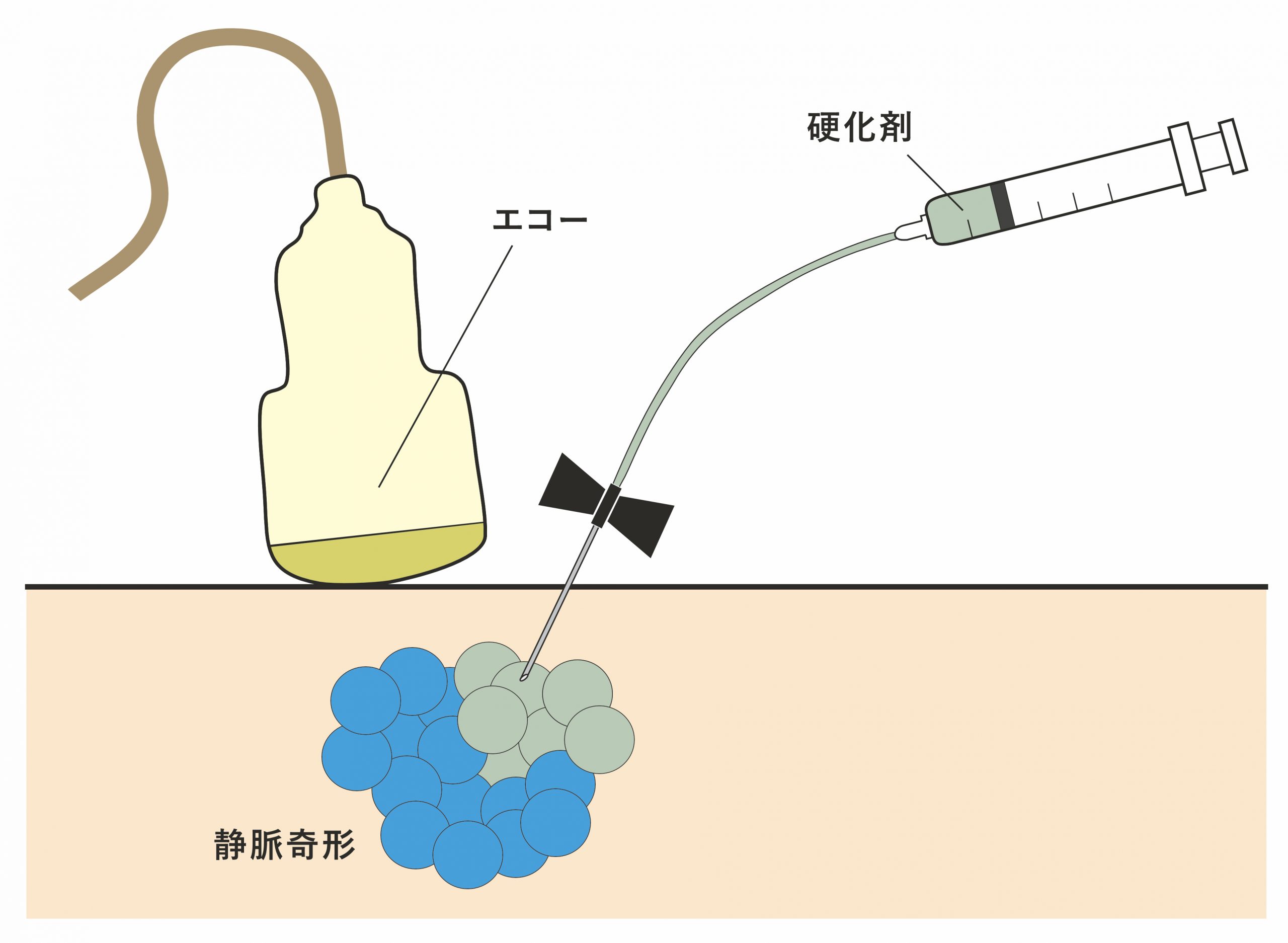 エコーで病変を確認しながら,皮膚の表面から針を刺す.